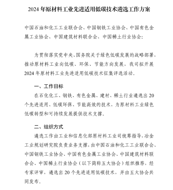 為貫徹落實黨中央、國務(wù)院關(guān)于綠色低碳發(fā)展的戰(zhàn)略部署,推動原材料工業(yè)綠色低碳轉(zhuǎn)型升級,進一步加快先進適用低碳技術(shù)推廣,工業(yè)和信息化部原材料工業(yè)司形成《2024年原材料工業(yè)先進適用低碳技術(shù)遴選工作方案》,正組織開展2024年原材料工業(yè)先進適用低碳技術(shù)遴選工作,將在石化化工、鋼鐵、有色金屬、建材、稀土行業(yè)遴選出20個先進適用、低碳環(huán)保、節(jié)能高效的技術(shù),為原材料工業(yè)綠色低碳轉(zhuǎn)型和可持續(xù)發(fā)展提供技術(shù)支撐。